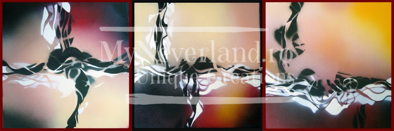 Triptic, realizat pe panza, compus din 3 tablouri, care pot fi aranjate impreuna, sau separat. Dimensiune 120/40 cm impreuna, 40/40 cm, individual. Tablourile nu sunt inramate, si nici nu au fost concepute pentru a fi inramate. Pentru orice informatii privind aceste tablouri folositi formularul de "contact" sau adaugati produsul in cos.