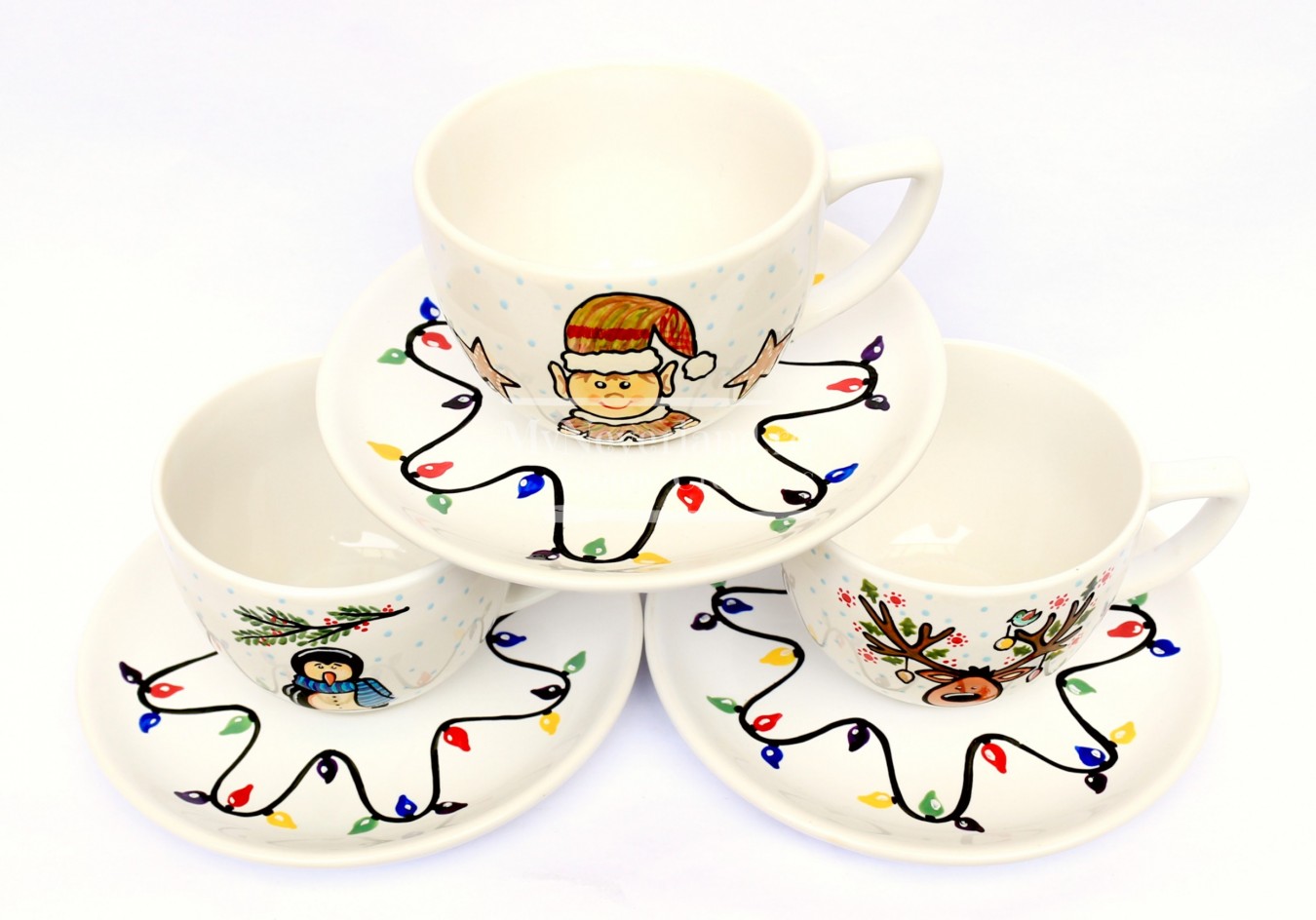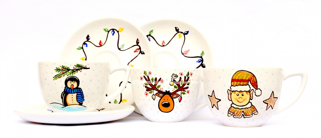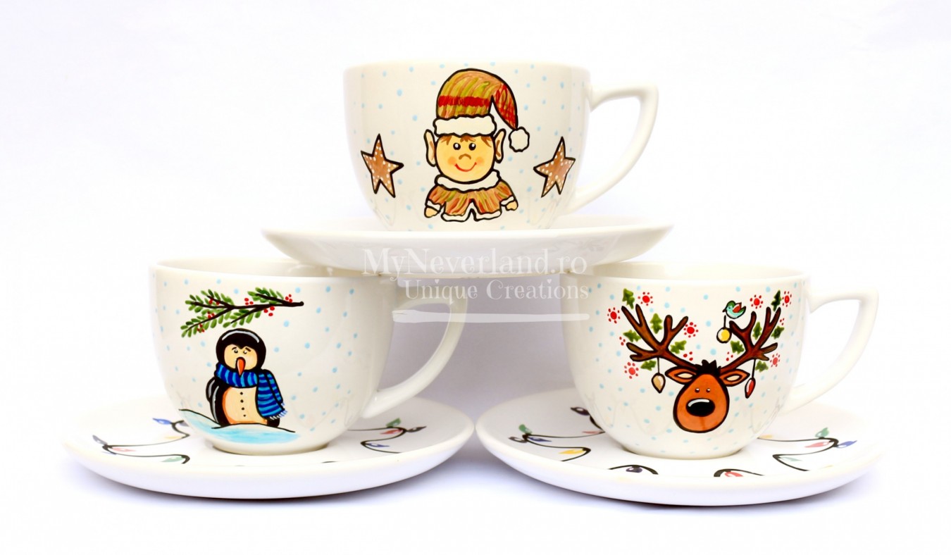 Set pentru cafea sau ceai, pictat manual. Compus din 3 cani si 3 farfurioare. Ceramica pictata manual folosind culori speciale pentru portelan si ceramica. Dimensiuni cani: Diametru: 9 cm si inaltime: 7.5 cm, capacitate cana 210 ml. Diametru farfurioara: 15 cm. Pentru orice intrebari legate de aceste obiecte, folositi formularul de "contact" sau adaugati produsul in cos.