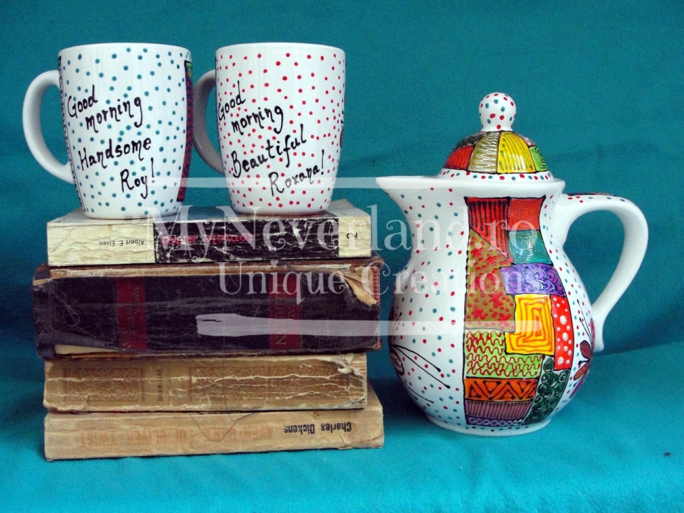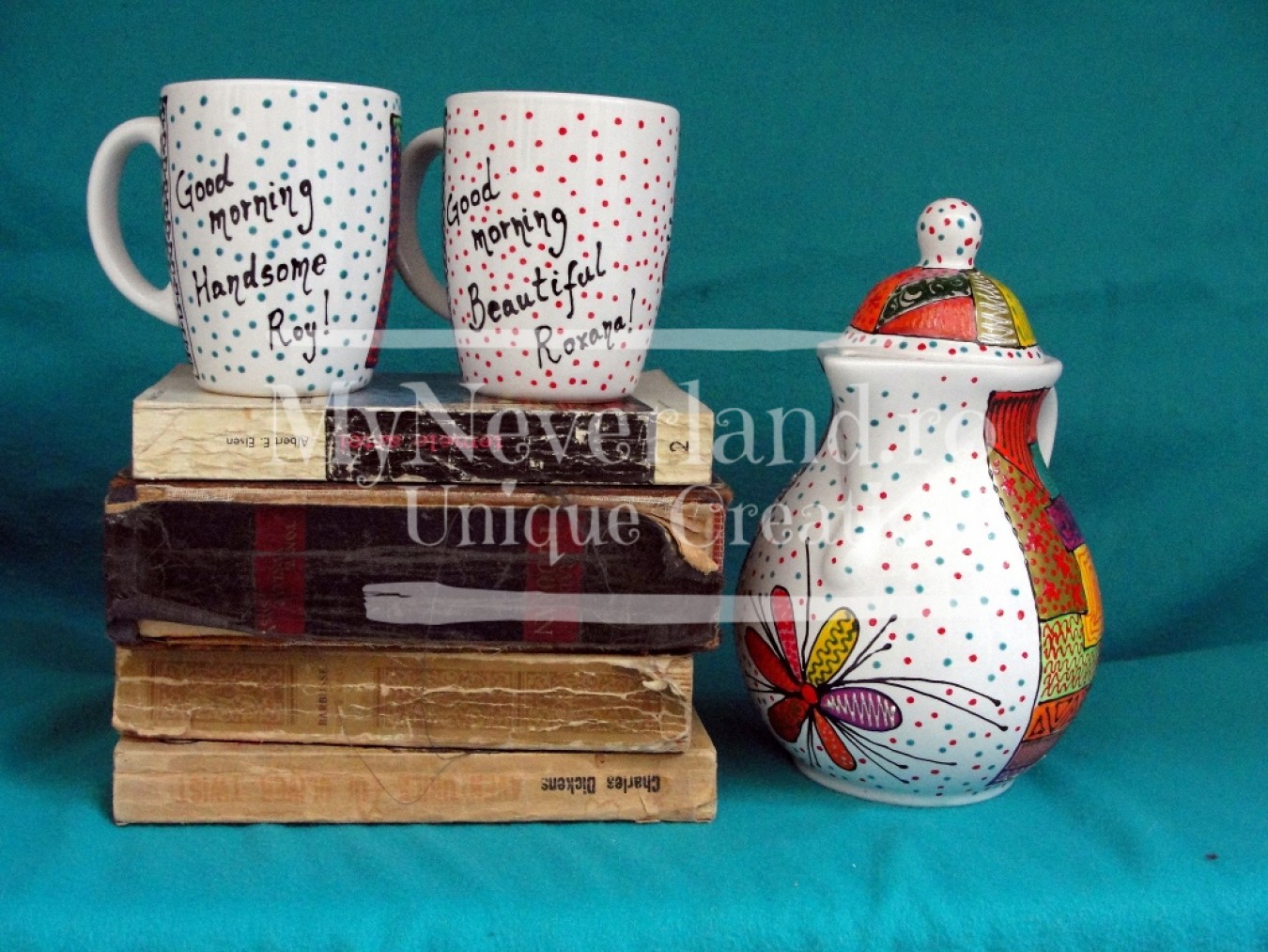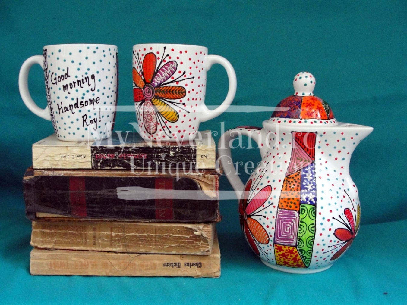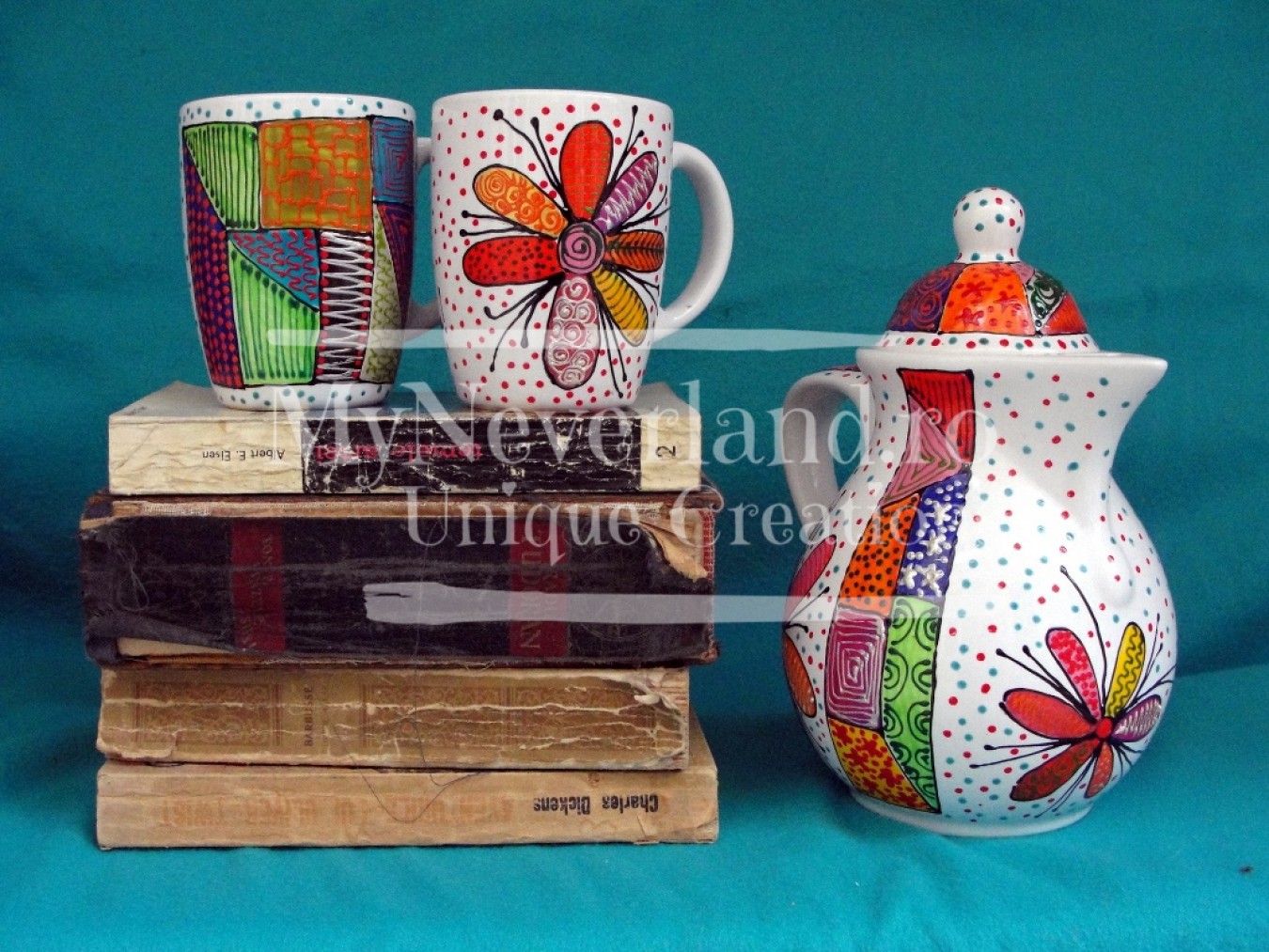 Set pentru ceai compus din ceainic (capacitate 1250 ml) si 2 cani (capacitate 250 ml) personalizate si pictate manual. Pretul afisat este pentru setul continand ceainic+numarul de cani cu farfurii care apar in fotografii. Setul pentru ceai se poate realiza cu orice numar de cani+farfurioara doriti, pretul modificandu-se in functie de acesta. Pentru orice intrebari legate de acest set, folositi formularul de "contact" sau adaugati produsul in cos.