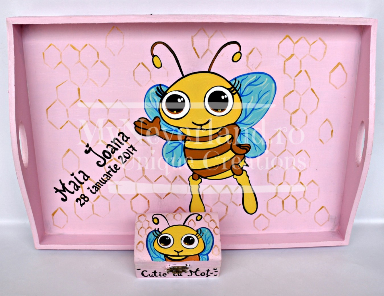 Tava si cutie din lemn, pictate manual in culori acrilice, lacuite la final pentru protectie si durabilitate. Realizate la comanda pentru a fi folosite la taierea din moț. :)