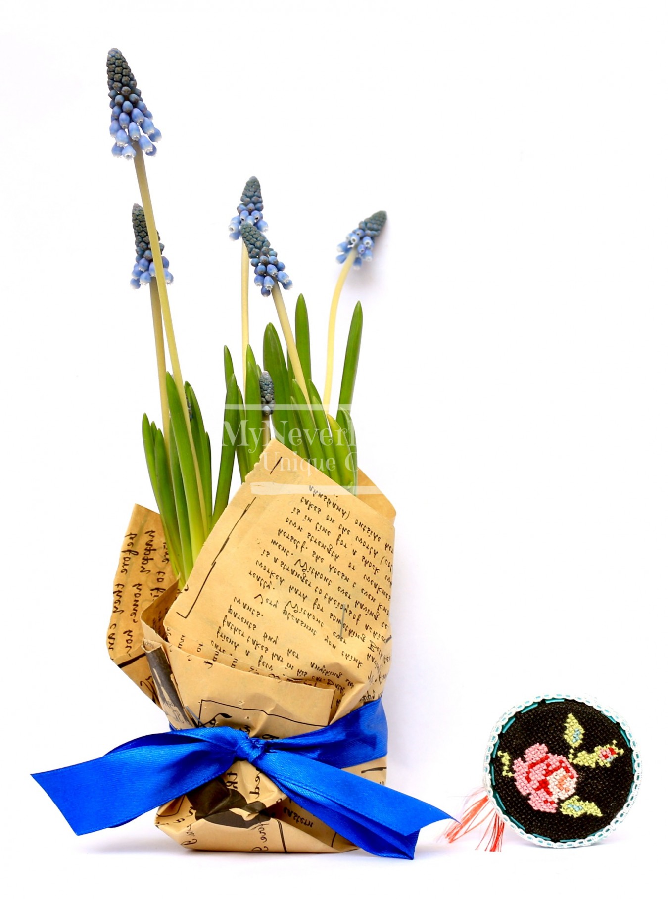Set format din brosa cusuta manual pe etmaina si ghiveci bulbi muscari, ambalat in hartie decorativa si accessorizat cu funda de satin. Pentru comanda va rugam sa ne specificati modelul brosa ales. Pretul se refera la brosa + ghiveci bulbi muscari, ambalat decorativ.