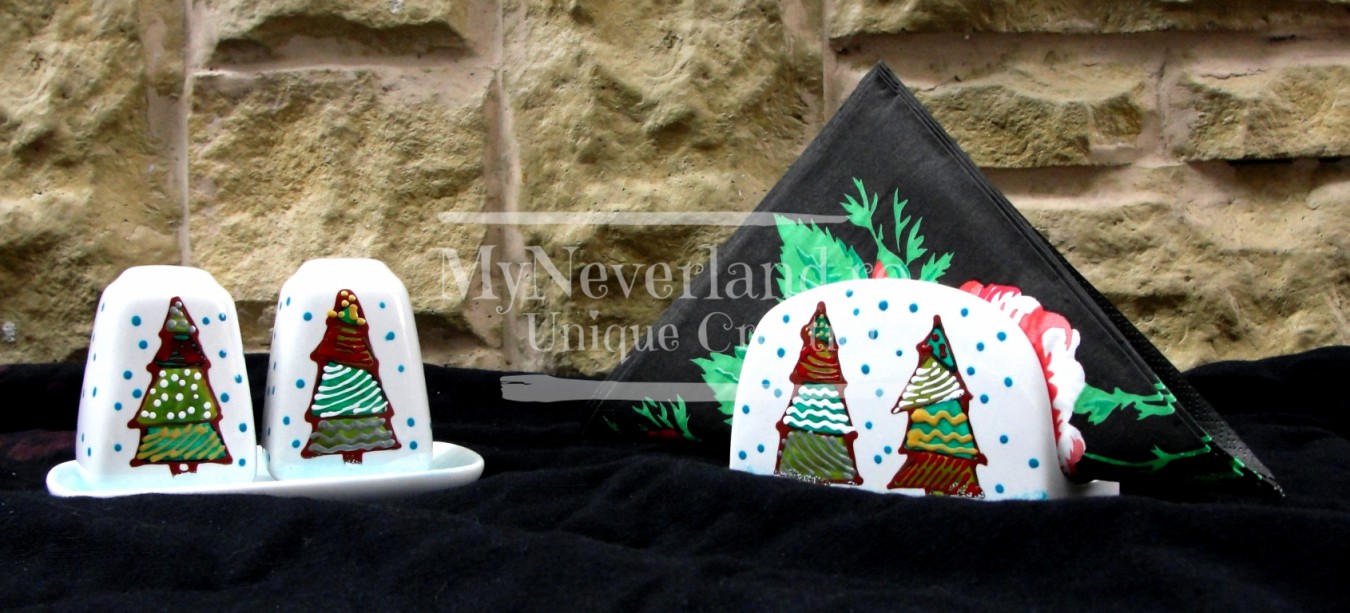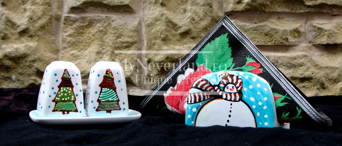 Set din ceramica, compus din 2 solnite (sare si piper), tavita/suport pentru solnite si suport de servetele. Pictate manual in culori speciale pentru ceramica si portelan. Pentru orice intrebari legate de acest set pentru masa, folositi formularul de "contact" sau adaugati produsul in cos.