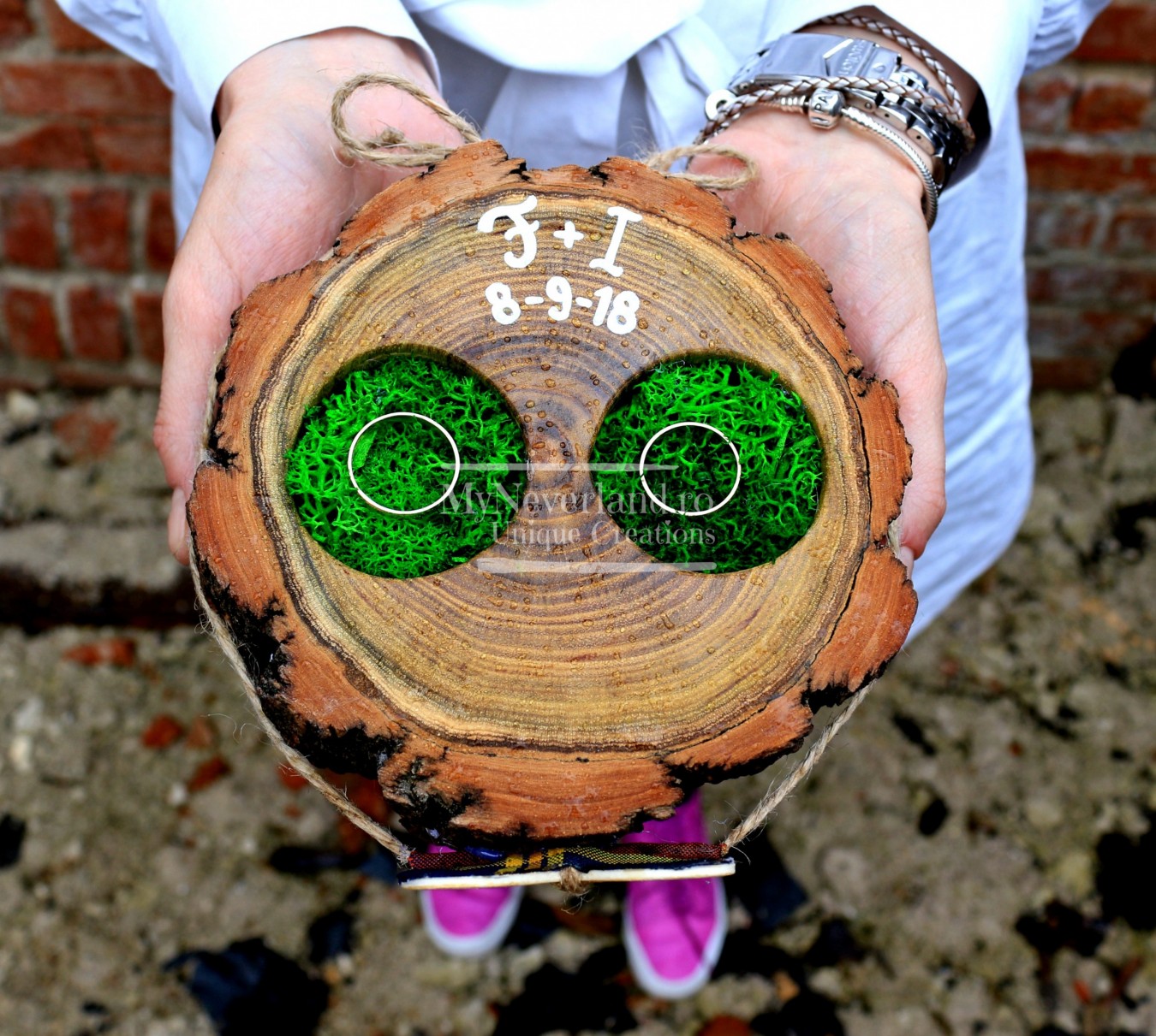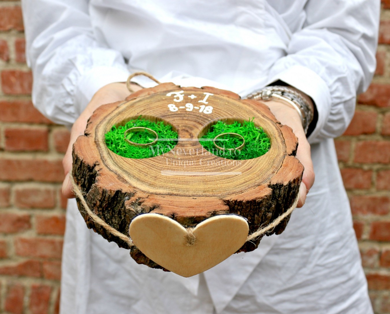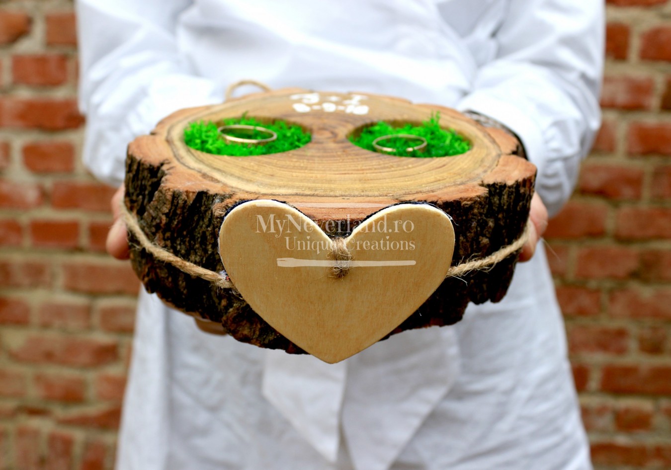 Suport de verighete, realizat manual din lemn natural, pictat manual si accesorizat cu moss nemuritor si decoratiuni lemn. Dimensiuni aproximative: diametru 14 cm, inaltime 7 cm. Atentie: fiind realizate din materiale naturale 100%, aceste suporturi de verighete nu sunt identice unele cu altele, putand exista vagi variantii de dimensiuni/ textura/ forma/ nuanta etc. Pentru orice informatii legate de realizarea unui suport de verighete din sectiune de lemn, folositi formularul de "contact" sau adaugati produsul in cos.
